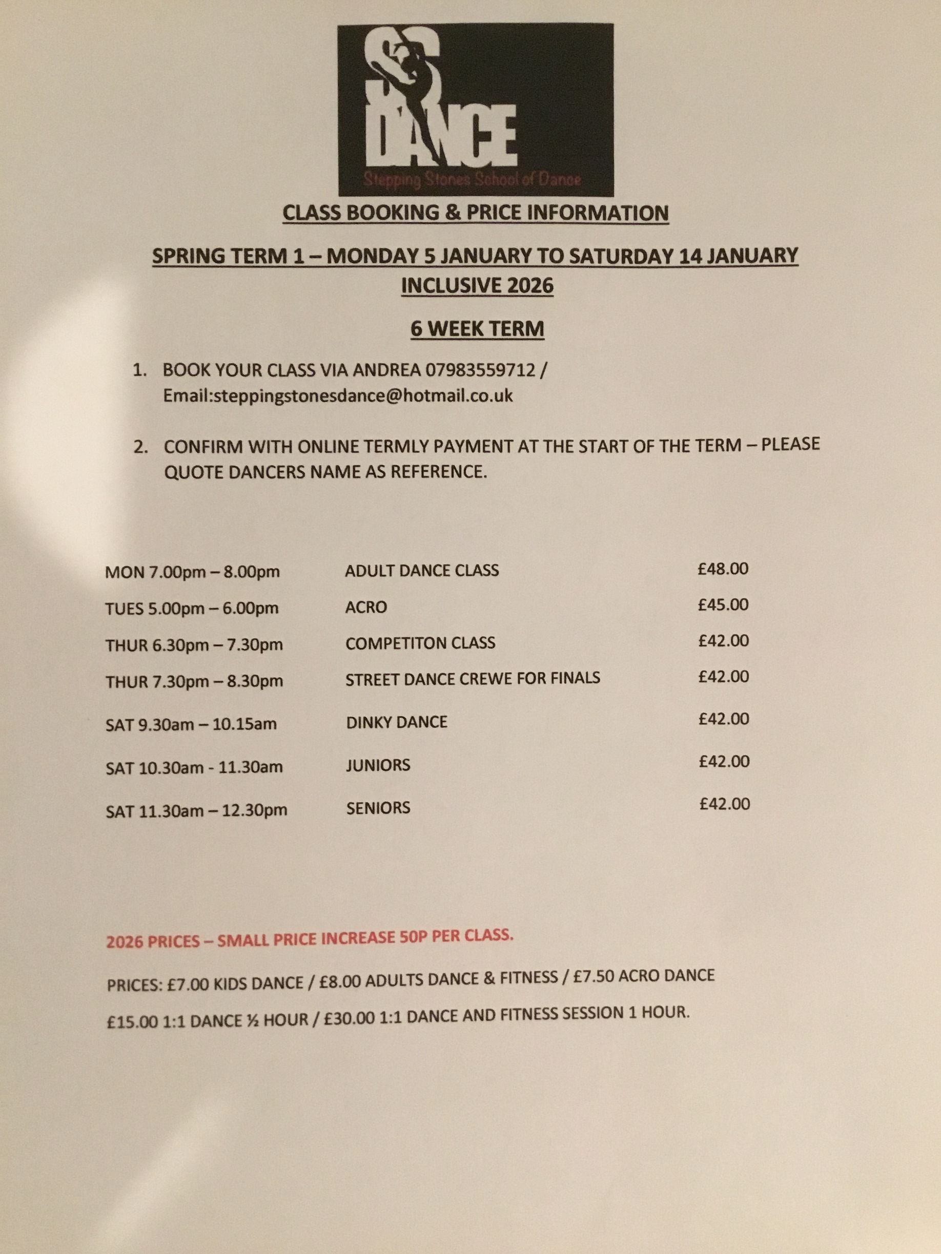 PRICES & BOOKING -SPRING TERM 1 2026